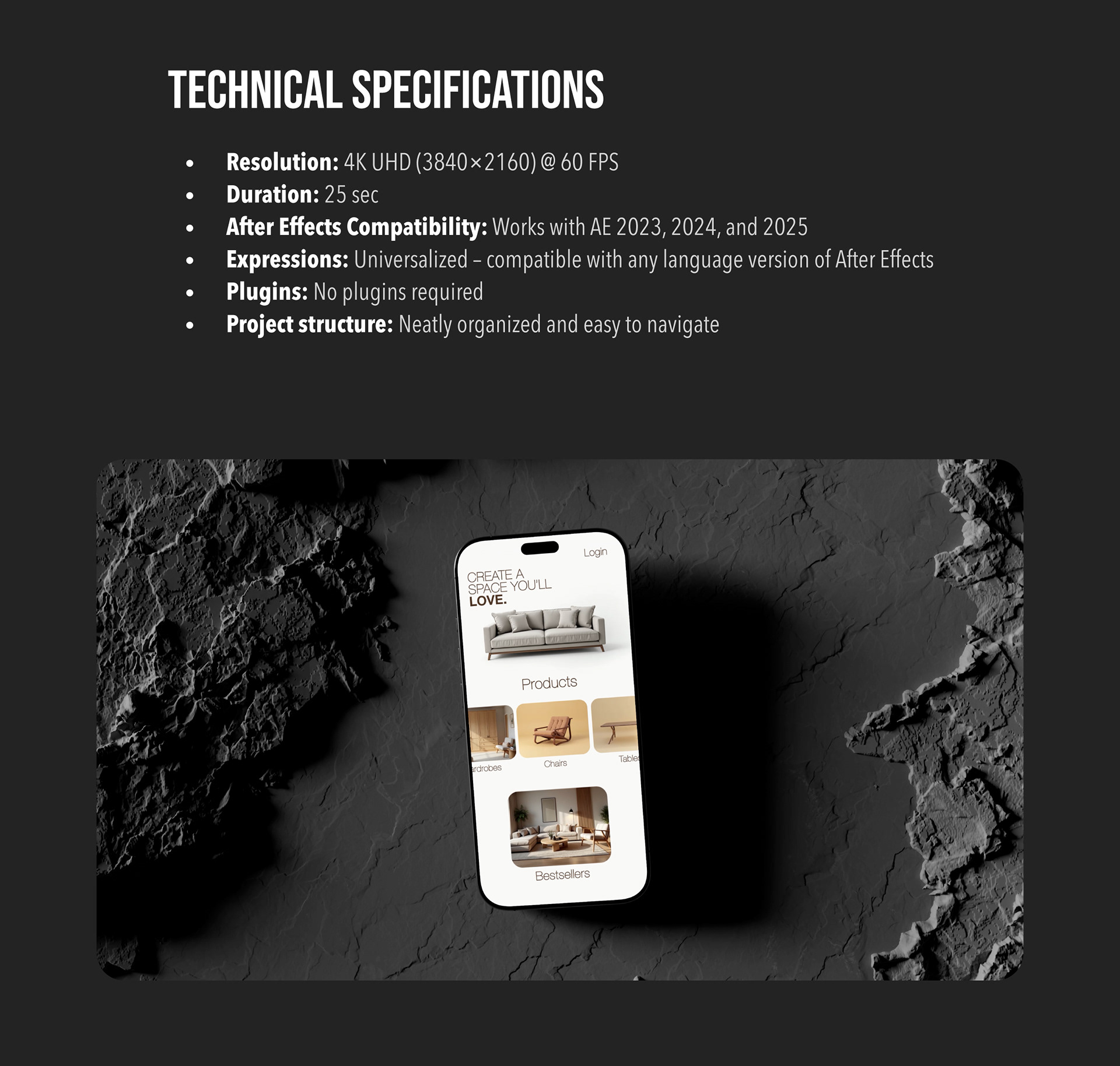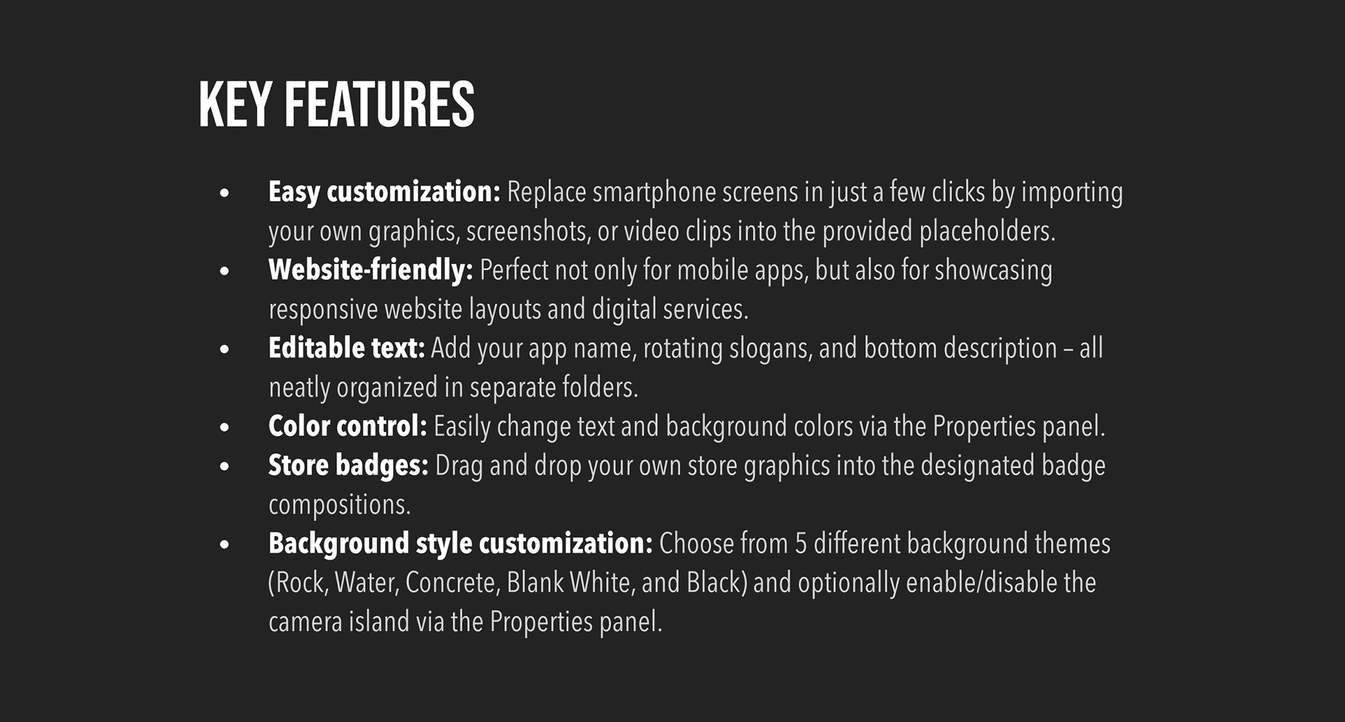Promote your mobile app or website in a modern and elegant way with this clean, dynamic After Effects template! Designed for easy customization and full control over both visuals and text